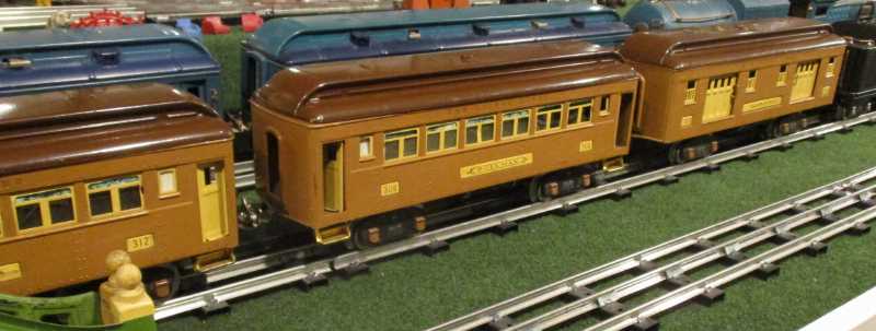 This 1932 set comes with the new for '32 392E steamer, the 384T tender with green stripes, and passenger cars 310 baggage, 309 pullman, and 312 observation in two tone brown. These cars are called "Baby State Cars."