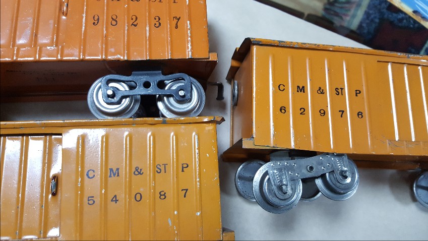 Here's a 114 CM&StP 54087. It has Lionel MFG embossed on floor, nickel plated trucks, Couplers are reattached and don't match. I think this is early and the crinkle coupler is correct.