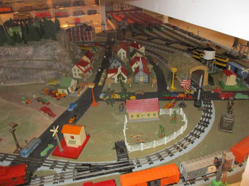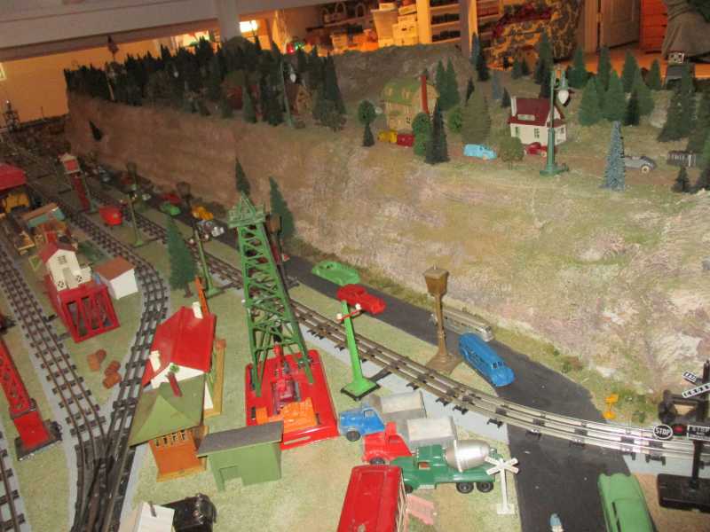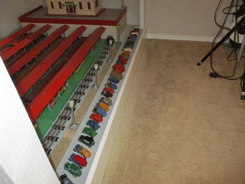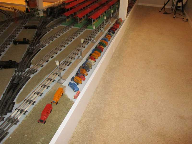 Teens and 1920s are on long arm of station and intermixed around the Schoenhut town. 1930s smaller cars with some Barclays slush cast mixed in are on the mountain. Very late prewar with black wheels and postwar  are on the postwar side of the layout, and the early 1930s Graham and Lasalle are in front of the short station leg.