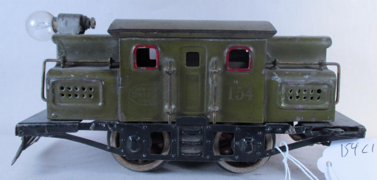 154c1 Olive green with gold painted handrails, type 4 motor with riveted brushes, black fiber corp plate, diecast wheels, stamped couplers, strap headlight no holes for pedestal, hand reverse mounted to frame, square roof without clipped corners, late body/frame.