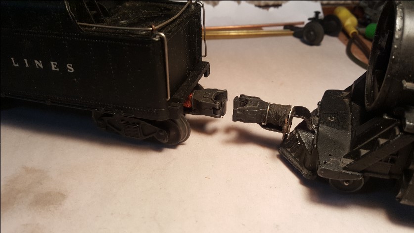 Using a drill bit I enlarged the opening for the coupler bracket. I just did a test by just pushing the engine through the 031 curve and watched the leading tender trailing truck very closely. It worked fine I think now I have it. Now repaint the pilot. Then reassemble the engine.