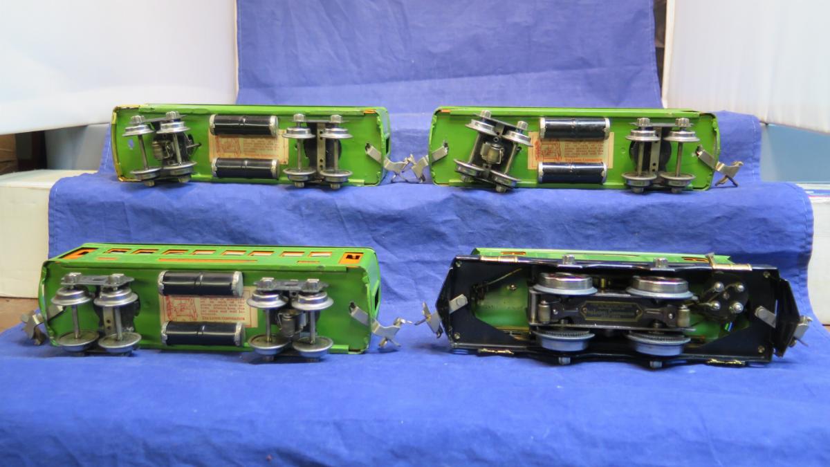 It takes many years, in my case near 50, to develop an eye for restorations vs. original. You not only have to be able to recognize the right color, but also the patina. Very early Lionel was spray-painted, sometimes unevenly, colors were mostly dark greens, maroon and olive. Classic period (started early-mid 1920's) was mostly dip-painted, earthy-tone colors, resulting in paint runs and thick blobs, mainly at frame ends, when the piece was hung to dry. In 1935 colors changed from earthy tones like terra cotta, mojave, pea green etc, to more-primary colors, 45N green, bright red, silver, ivory-white. Also, in 1935, Lionel went back to spray-painting, resulting in a finish with "orange peel" texture instead of runs. Silver is an exception as it was used before 1935, and I don't think it was ever used for dip-painting. Also black frames continued to be dip painted into later prewar production, well past 1935.