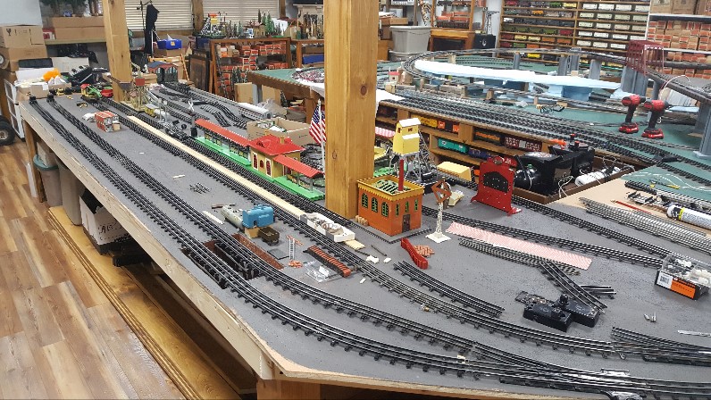 I have been making progress on small details on the layout. Attached are photos of a transition track I made to mate T-rail with a UCS operating track. No such track was made for T-rail. Also shows a T-rail/UCS section that I made many years ago, to look like what Lionel "should have made". This is too time consuming, as I need several UCS operating tracks in the yard area.