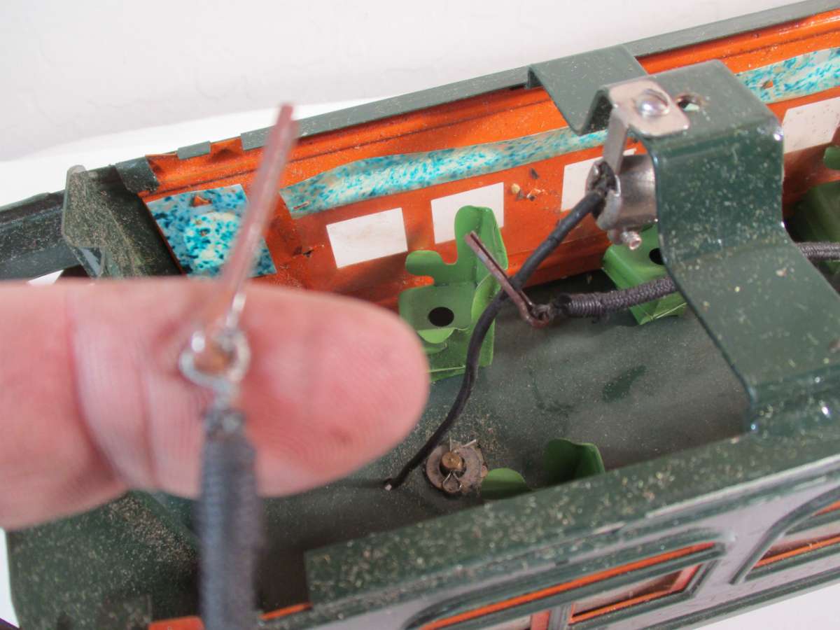 I took the one out of the first car because I always put the trains back to stock, but when I saw the construction I realized this may be a kit by a company other than Lionel. The light head has a slot and a tab that were used to tie it to the crossbar in the cars.