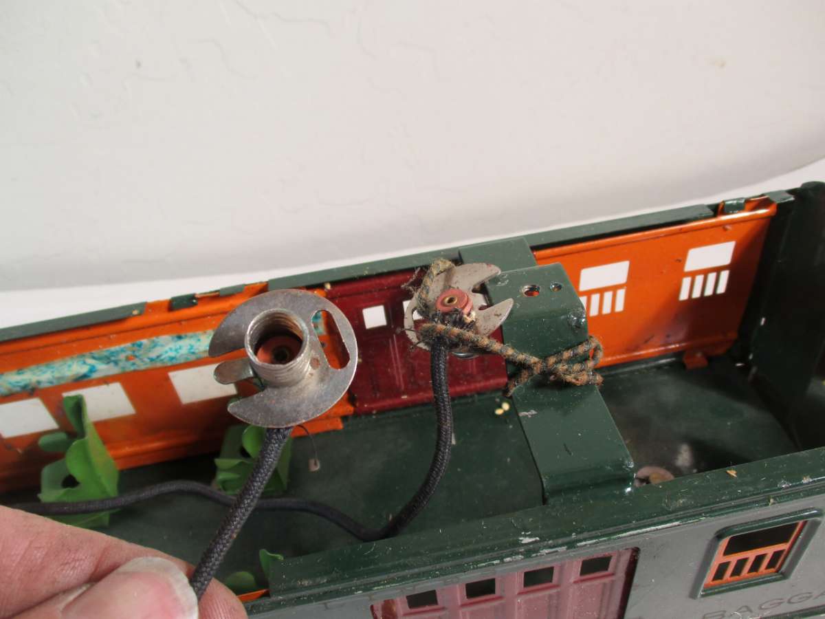 Here is the exact light fixture, in one of my Illini cars. These were sold as accessory lights by AF for unlighted early cars, early to mid 1920's. The wires string between the cars and attach to a power terminal on a 3020 Boxcab loco.