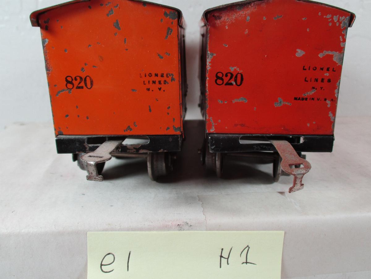 The car next to it is 820h1 Illinois Central 65784 darker orange sides and roof, type two frame, 2 lines data – C. 20000 W. 10000, 820 to left and LL to right on end, gold corp stamp on bottom.