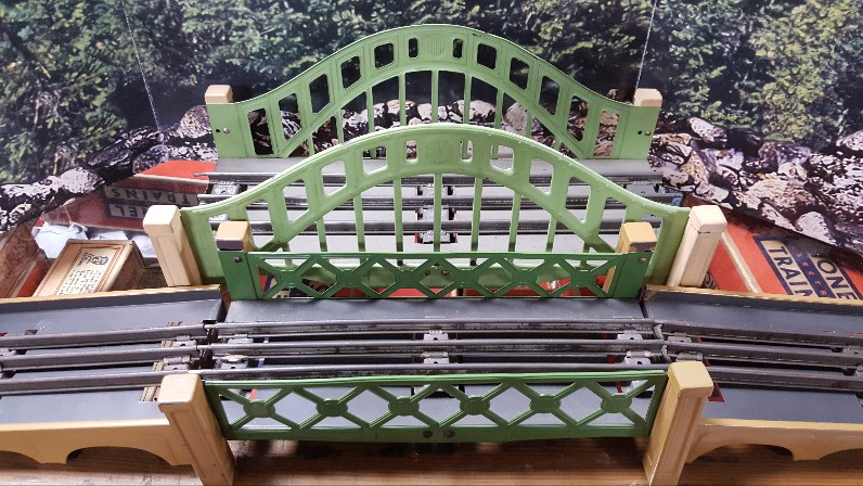 I have a 3 piece O Gauge 106 and a standard gauge 104 center-span, both with early boxes. Only the 110 O-gauge center span listing in the TCA Standard of the World book, mentions with or without wood finials. I have them in O and Standard.