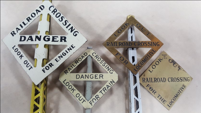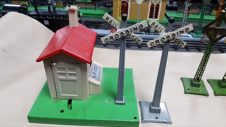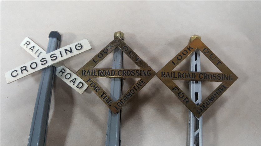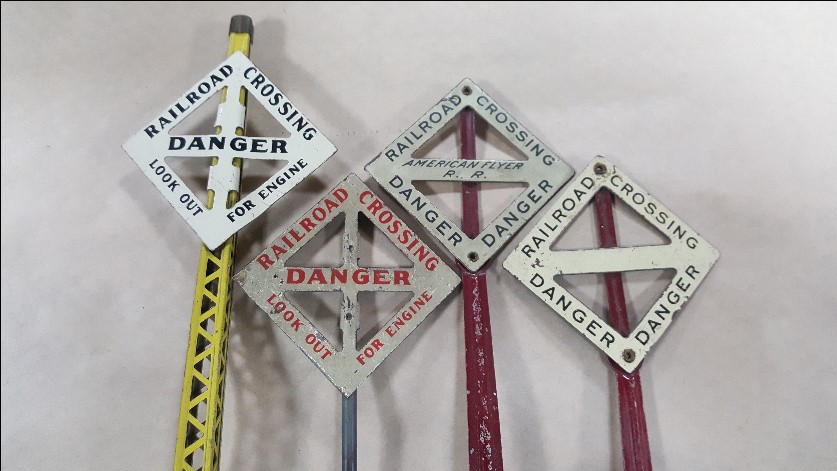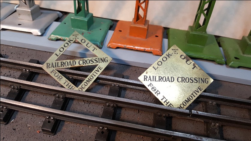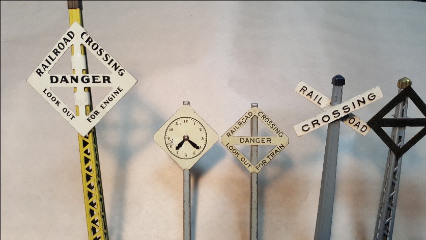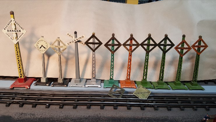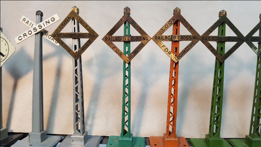 silver and gray with diecast (may be from a gateman) and the LL Jr type, also LL Ives and Winner, diamond is the same blank as used for the clock in this set, not same as an 068. Final one is Standard gauge size Hafner, with post and base made by Lionel, litho diamond by Hafner.