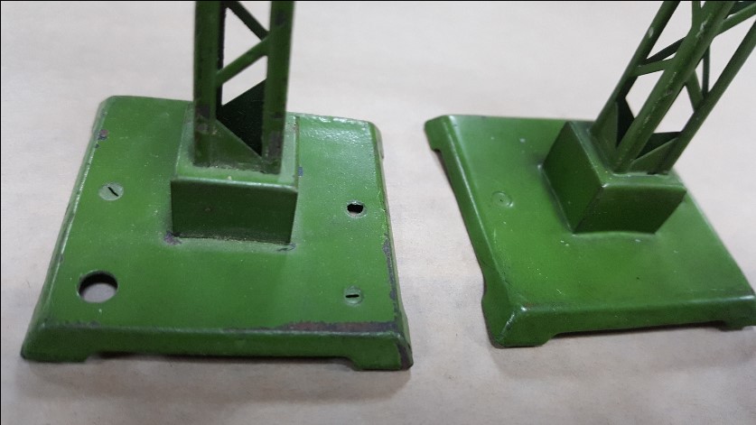 Also note in the last pix that I posted with the blank brass sign, one pea green 068 has an extra large factory hole in a corner, as if it was made for a wire terminal. I can't think of an electric accessory that is on this post, so not sure why that base would be factory-stamped as such. Any ideas?