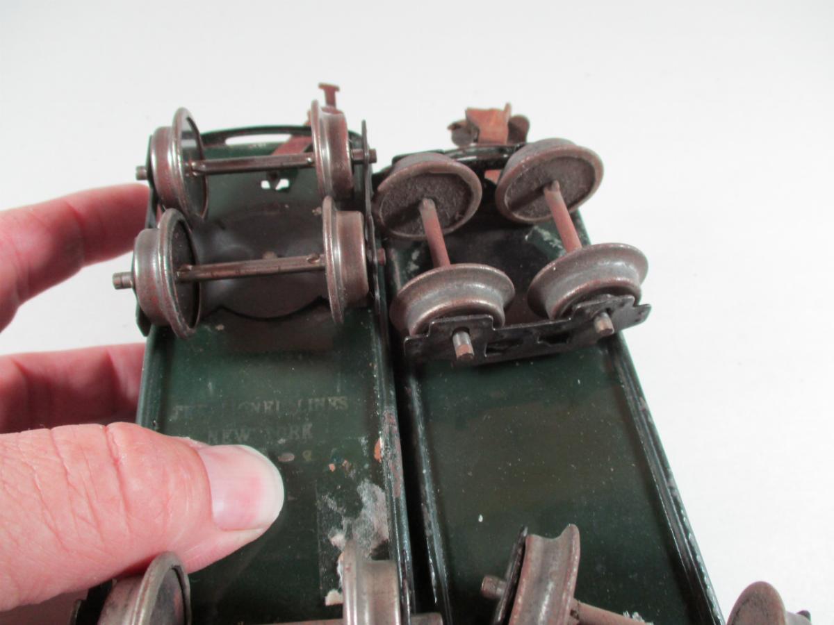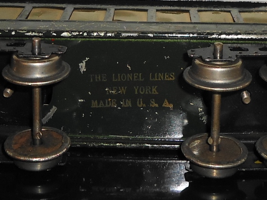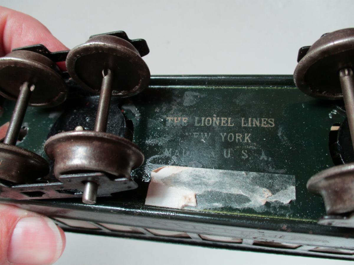 Then I have another dark green set with the later trucks. This is the one with the block lettering over the doors on the 602. The baggage does not have slots, but does have the The Lionel Lines stamp. This car also has one truck with dimples. The NYC over windows on 601 pullman is 3.125" long, bottom has slots, but no stamp.