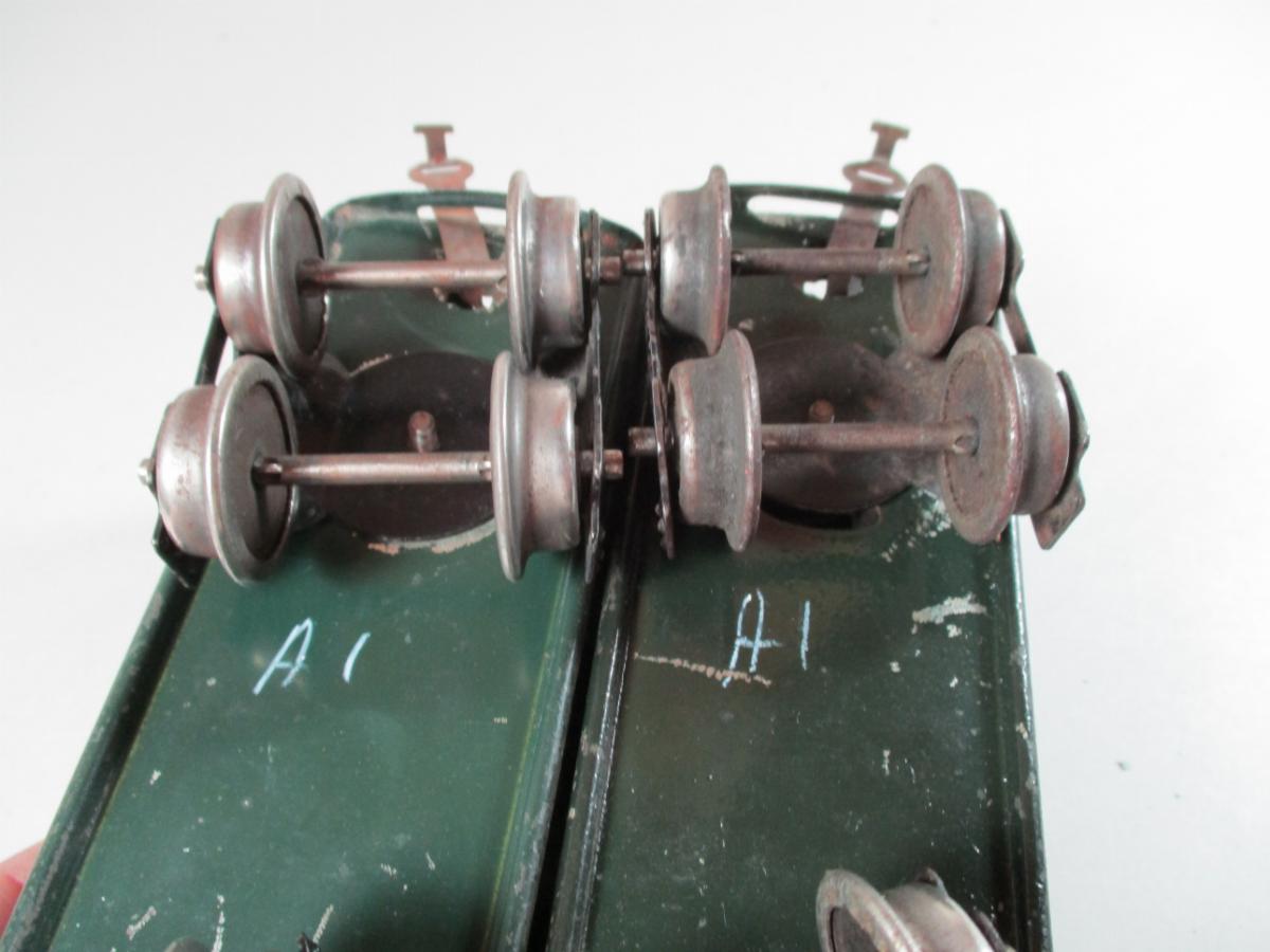 Two cars with the long or half moon trucks and wide tread wheels. The 602 baggage has slots in the bottom and no lettering. All my baggages have door handles.