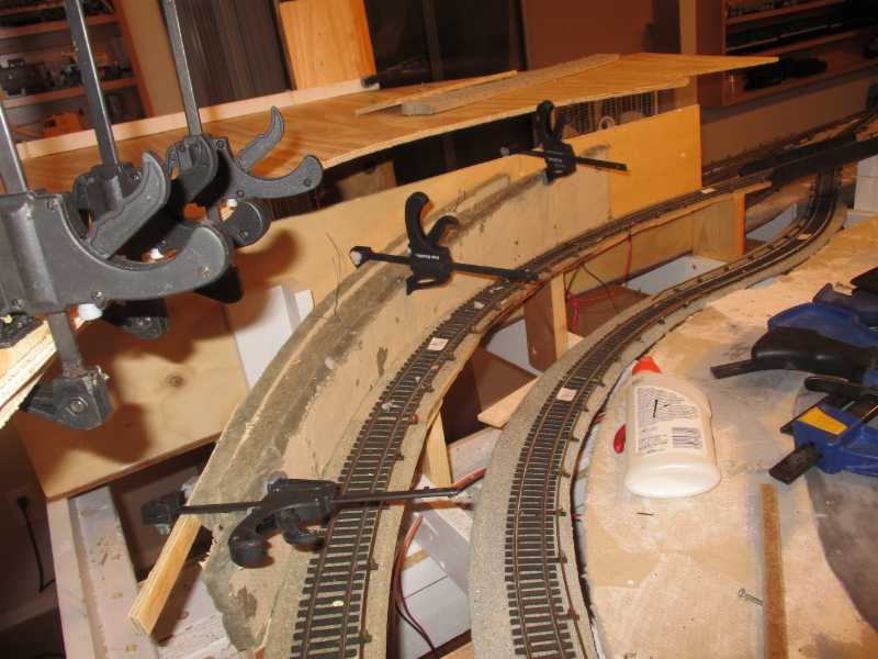 The little black clamps are really handy. I have 2 dozen of them and 4 of the bigger blue ones. With the little ones I clamped the risers and then adjusted them so the train moved smoothly through changes in direction and momentum. Once it was perfect, I screwed and glued the joins.