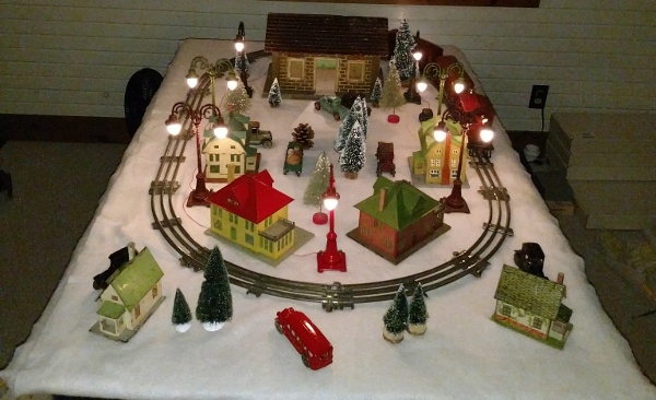 Nice table layout. Did you use a white sheet or Christmas felt for the snow. Looks like you have the Lionel/Shonhut station. Looks nice with the lights. Happy Holidays!