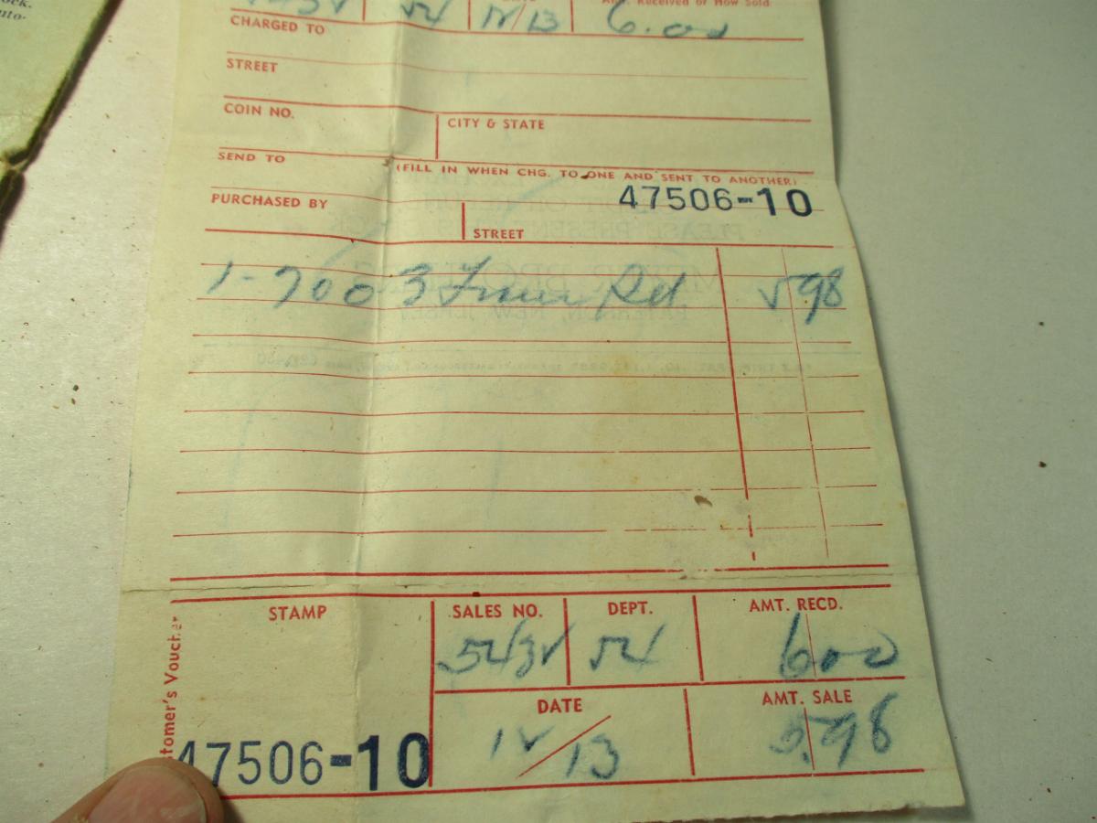 Paperwork with the set is a lubrication sheet dated 5-39, an O27 1067E set instruction sheet dated 6-40, and the original receipt showing a purchase date of 12-13 but no year. The set was $5.98