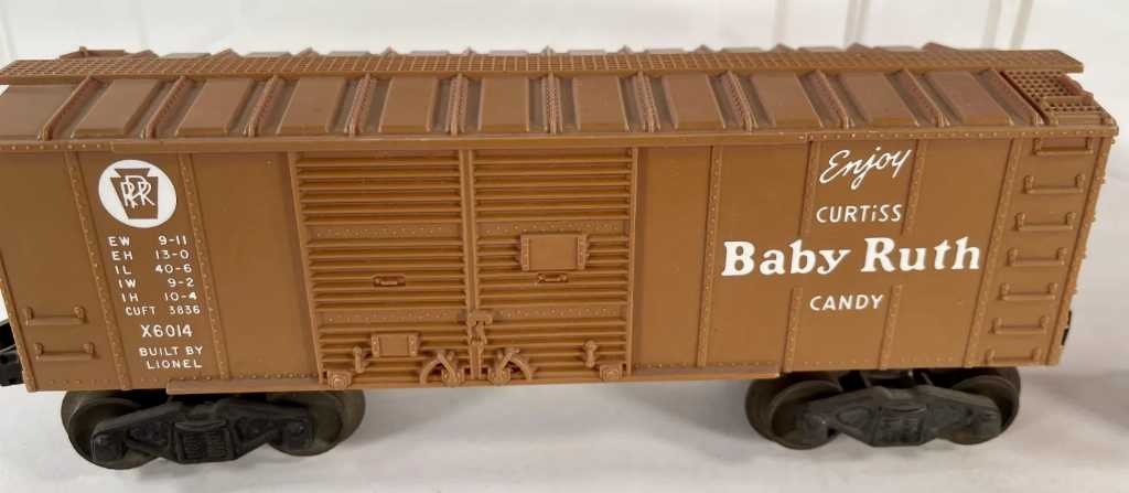 The baby ruth car seems to be unpainted brown plastic. Collectors call these weird cars "Boy's Train Cars," but they are probably just samples or test shots.