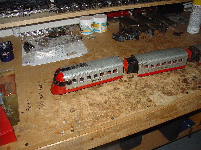 If you haven't done one you should restore a set, 1701, 1702, 1703, that includes the head-end car, in Rail Chief colors, dark red with maroon skirts and ends. This was an actual uncataloged set that came with a 259E in the mid to late 1930's. The head-car is the same as the tail car, but with a slot for the coupler to mount. Also the vestibule would have to be reconfigured on one of the cars.
